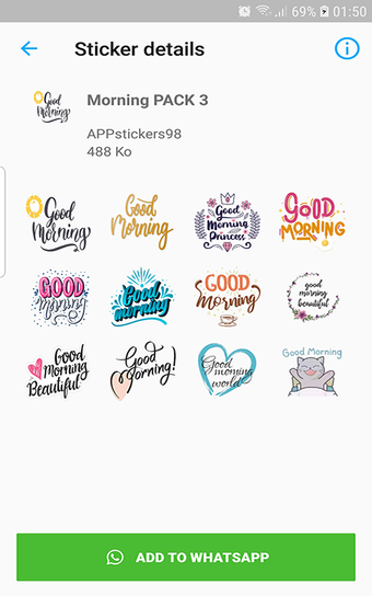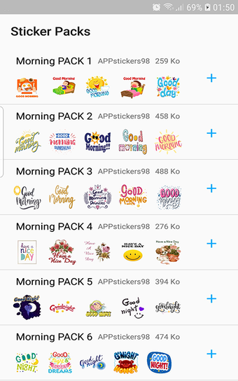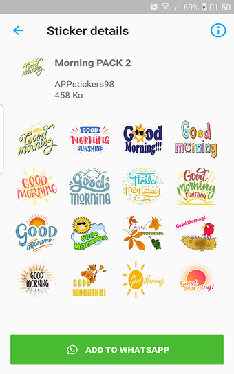 Good MorningステッカーにはAndroid 9.0以上が必要です。現在のプログラムのバージョンは1.0で、英語、ドイツ語、ロシア語で実行できます。